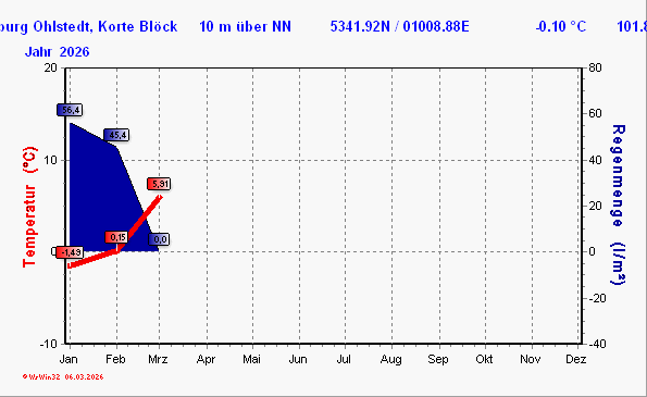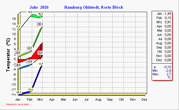 Höchste Temperatur, durchschnittliche Höchsttemperatur, Durchschnittstemperatur, durchschnittliche Tiefsttemperatur, niedrigste Temperatur (des jeweiligen Monats).